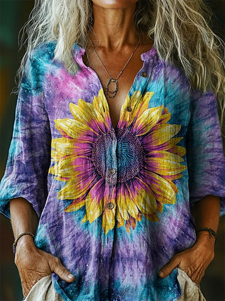 Women's Vintage Colorful Sunflower Pattern Art Print Casual Cotton Linen Shirt