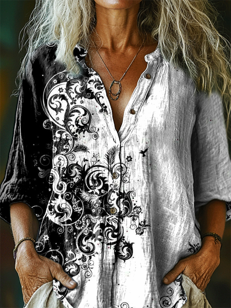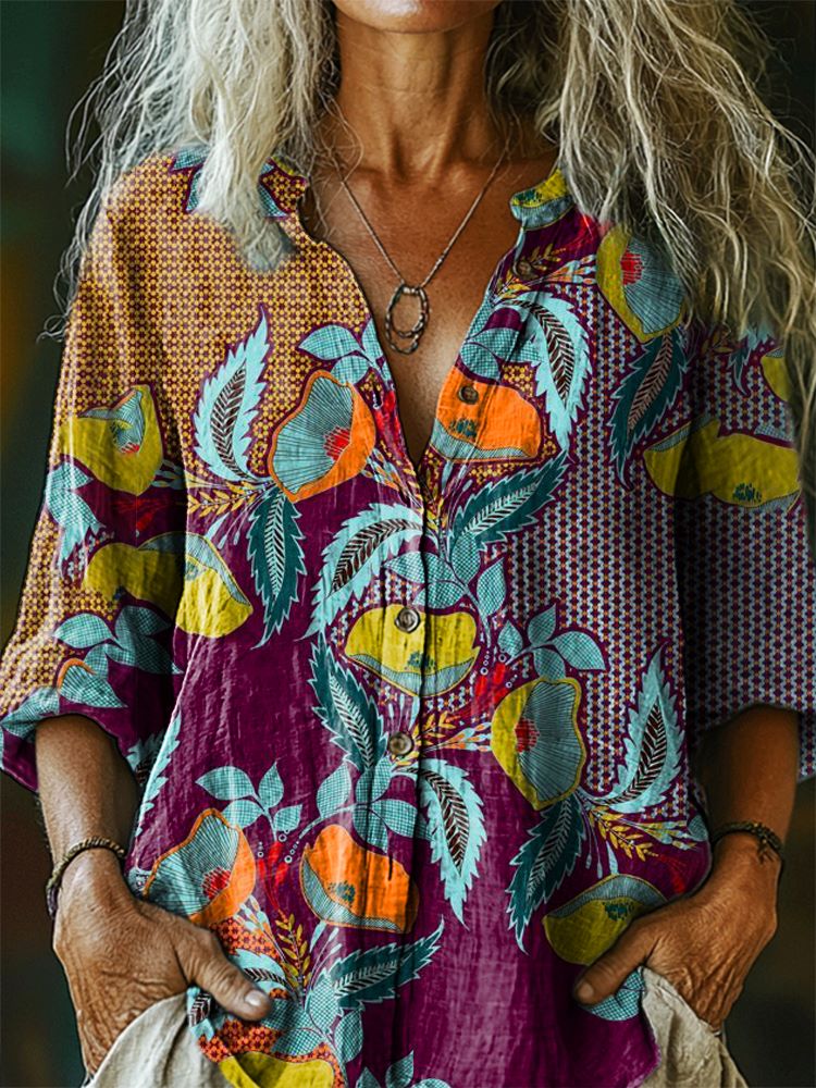 Women's Floral Contrast Art Print Casual Cotton and Linen Shirt