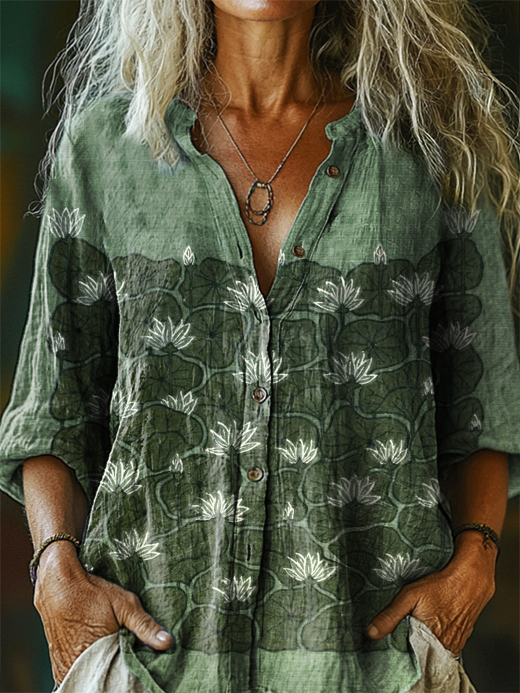 Women's Good Luck Lotus Flower Art Print Casual Cotton and Linen Shirt