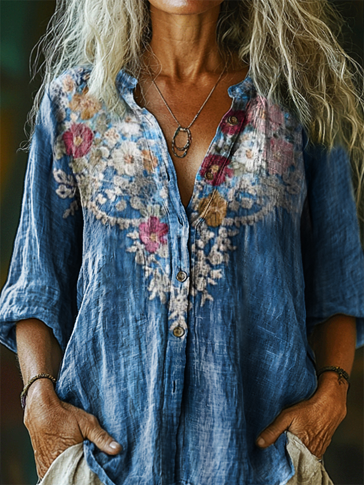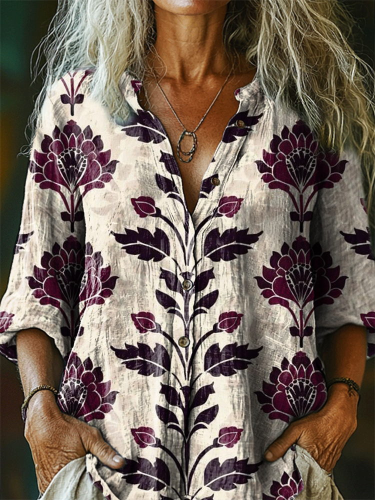 Women's Vintage Floral Art Print Casual Cotton and Linen Shirt