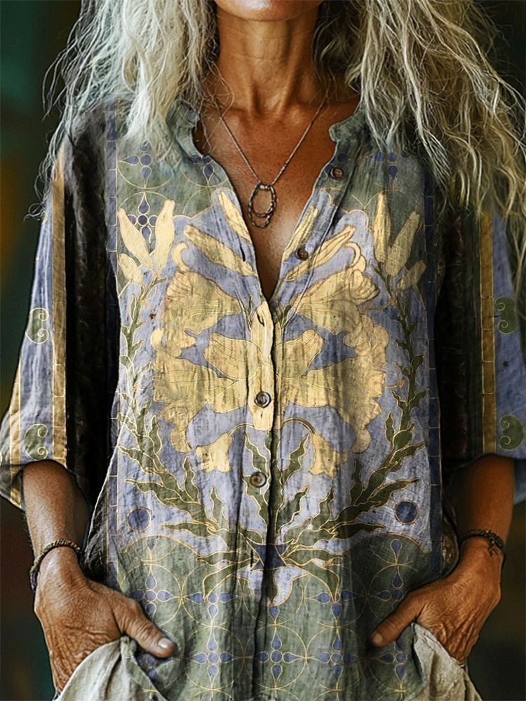 Women's Vintage Bohemian Floral Art Print Casual Cotton Linen Shirt