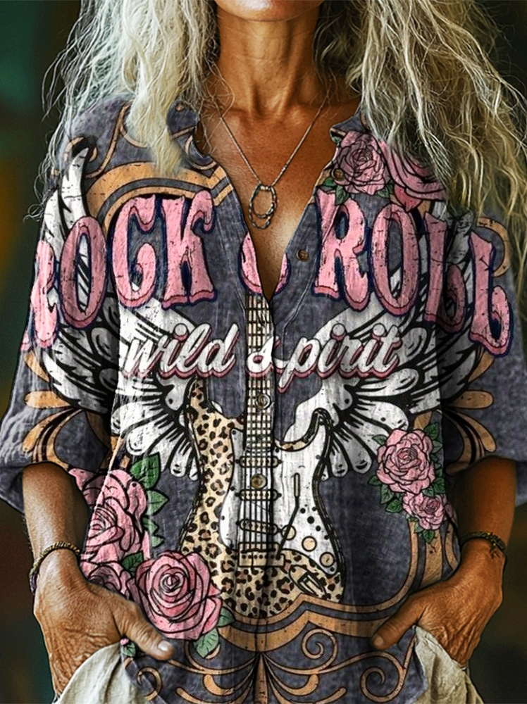 Women's Retro Rock Art Pattern Print Casual Cotton Linen Shirt