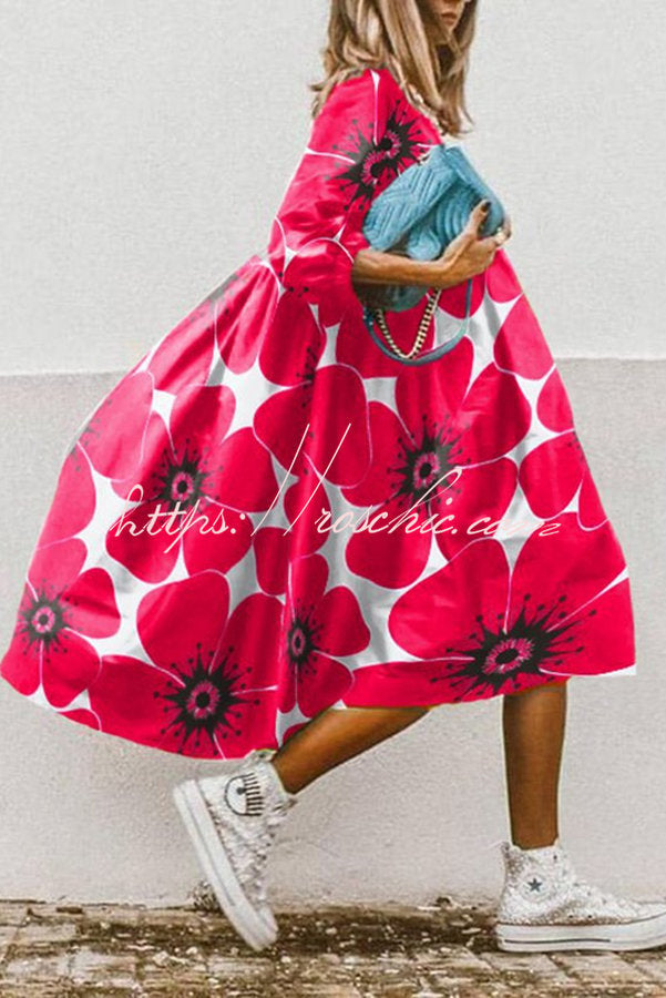 Vintage Floral Print High Low Hem A-Line Midi Dress