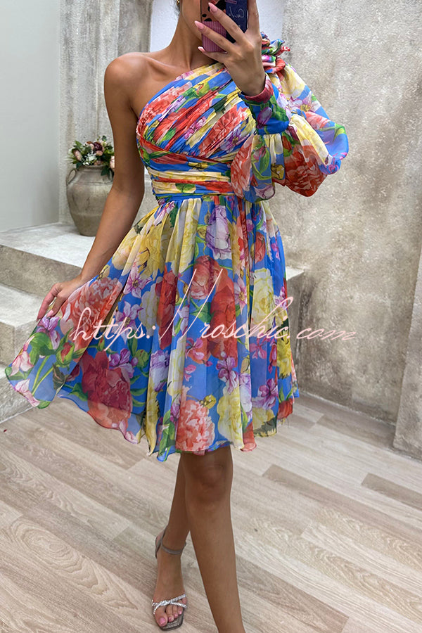 Vivid Visions Floral Print Pleated One Shoulder Sleeve Swing Mini Dress
