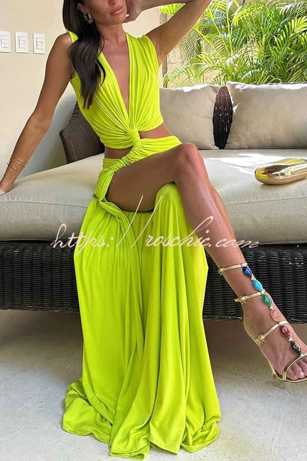 Queen Style Metallic Fabric Cross Neck Cutout Slit Pleated Maxi Dress