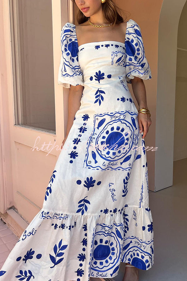 Sherbert Linen Blend Unique Print Square Neck Bubble Sleeve Maxi Dress