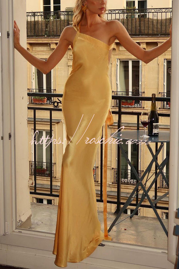 Moonlit Soiree Satin Asymmetrical One Shoulder Backless Strap Maxi Dress