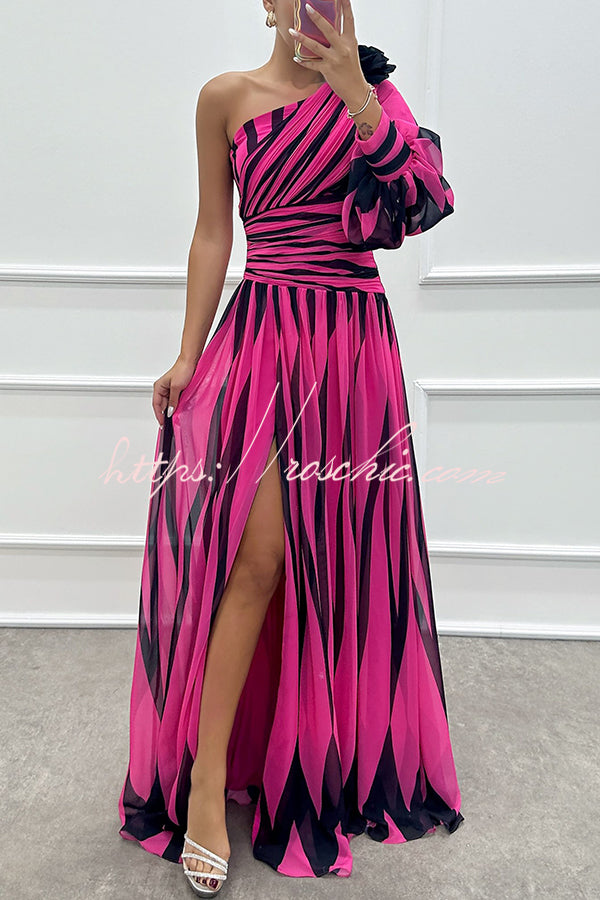 Purely Charming Printed Rose Pendant One Shoulder Pleated Slit Maxi Dress