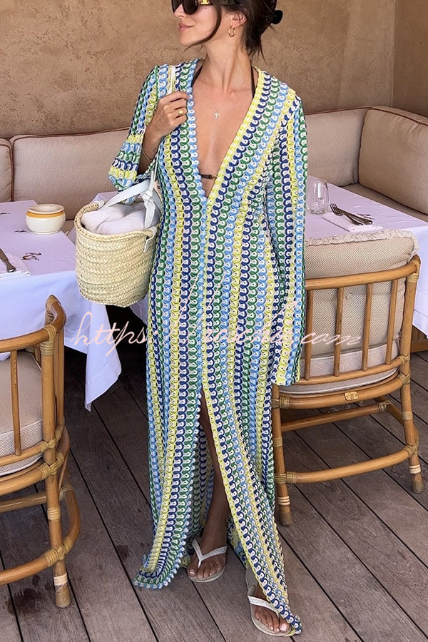 Bondi Beach Knit Colorful Wave Print Long Sleeve Vacation Maxi Dress