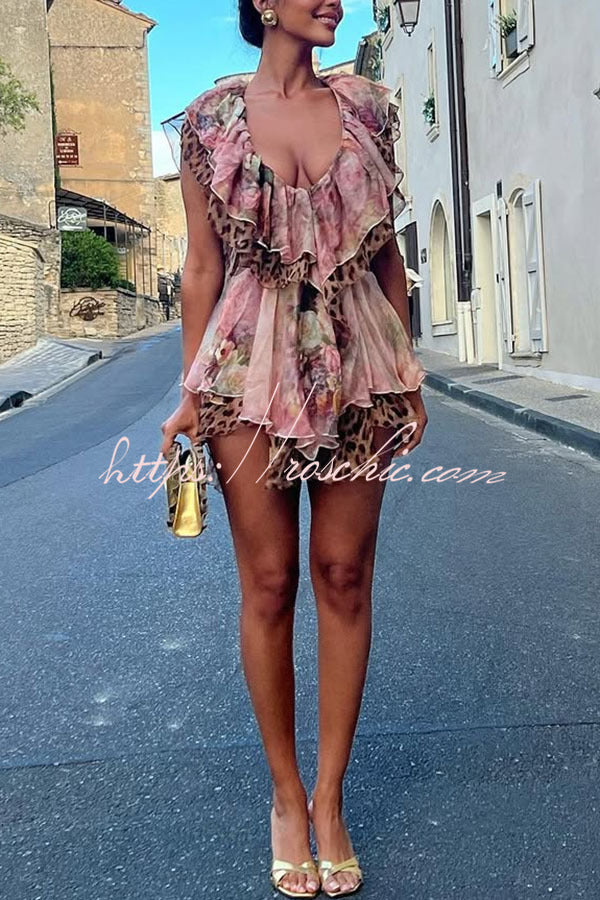 Dreamy Island Floral Leopard Print Cutout Waist Tiered Ruffles Mini Dress