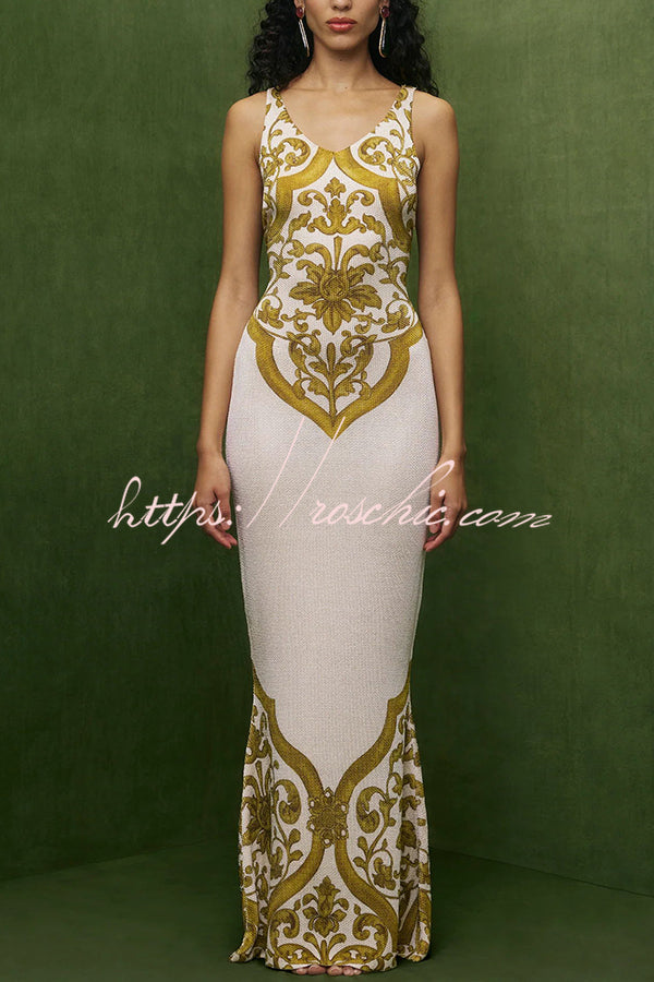 Sicilian Inspired Knit Symmetrical Unique Print Stretch Fishtail Maxi Dress