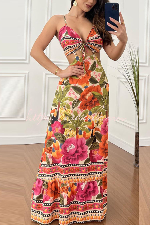 Mexico Style Tropical Print Ring Cutout Lace-up Vacation Maxi Dress