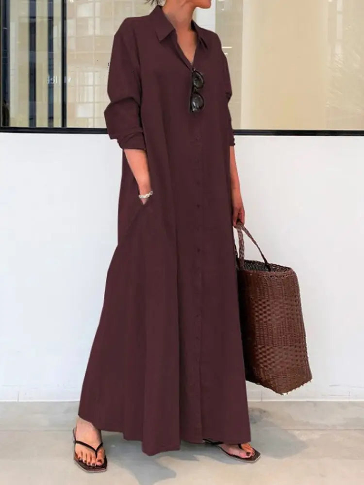 Women's Retro Button-Down Shirt Collar Solid Color Casual Dress