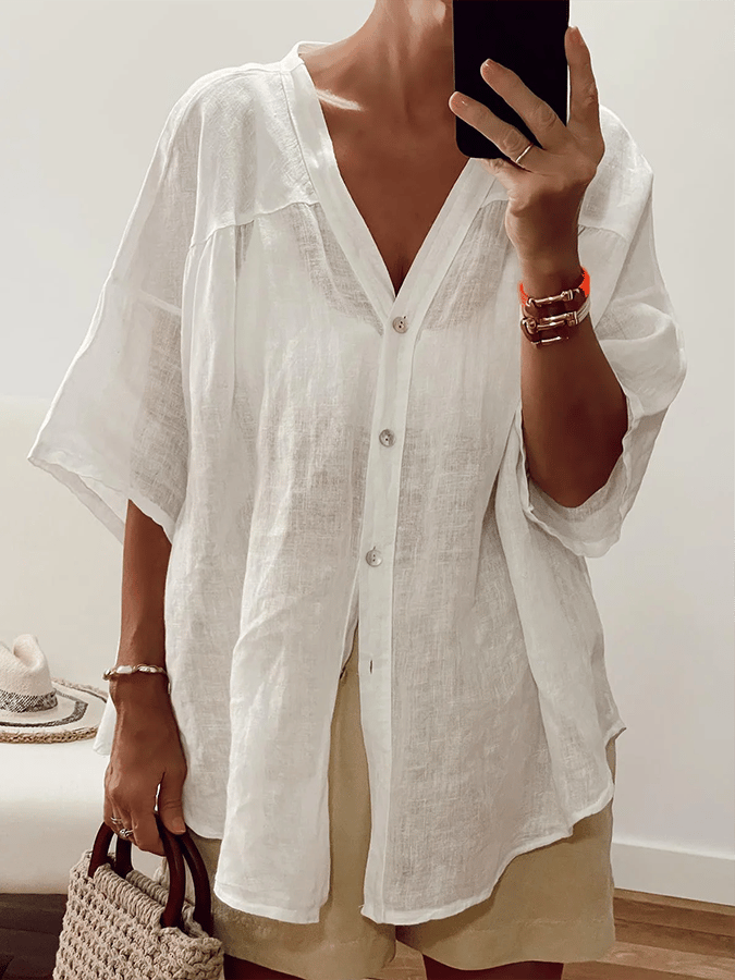 Women's Casual Solid Color V-neck Cotton Linen Top