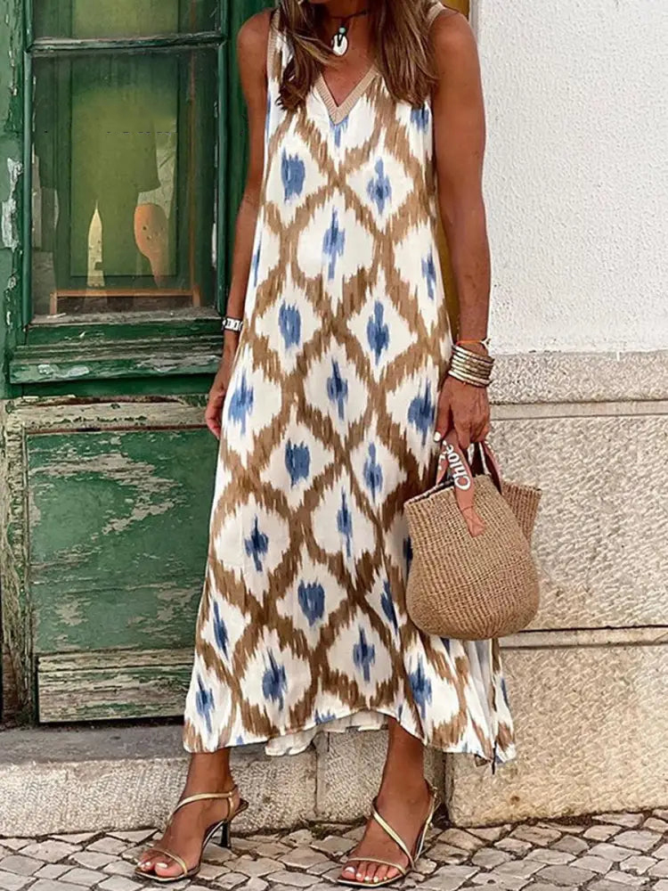 Women's Ethinic Style Pattern Printed V-Neck Split Midi Dress