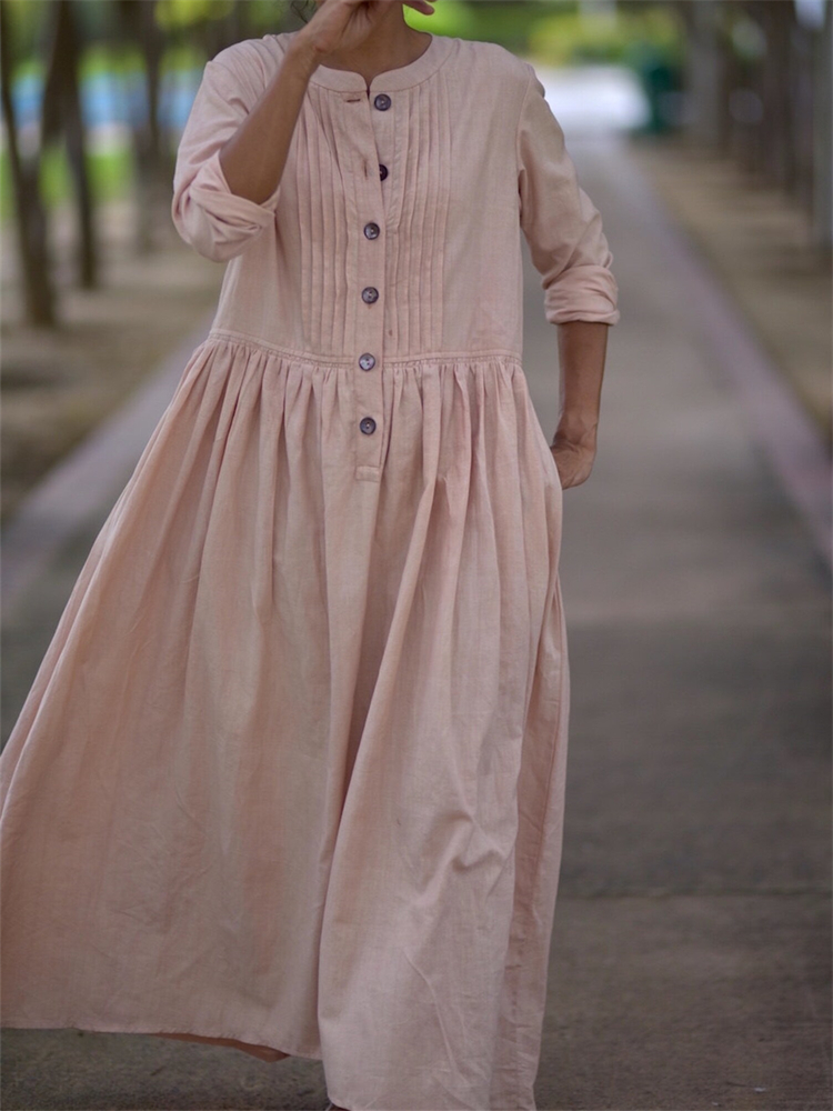 Vintage Pintucked Button Up Pleated Linen Blend Maxi Dress