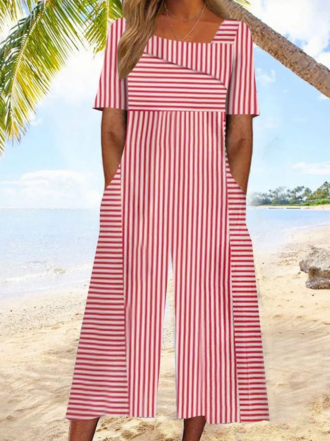 Women's Casual Red Striped Short Sleeve Jumpsuit