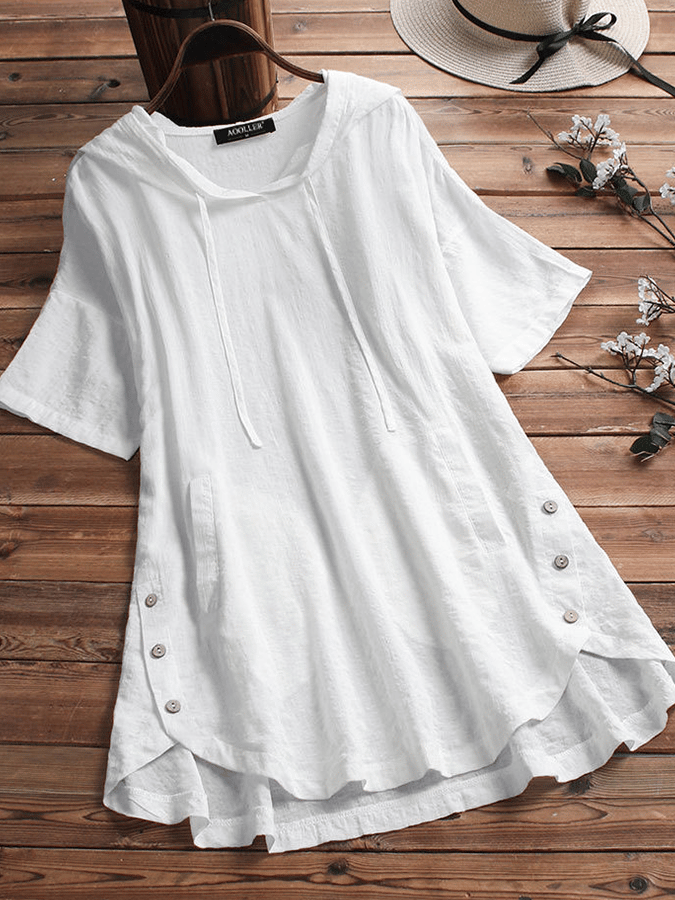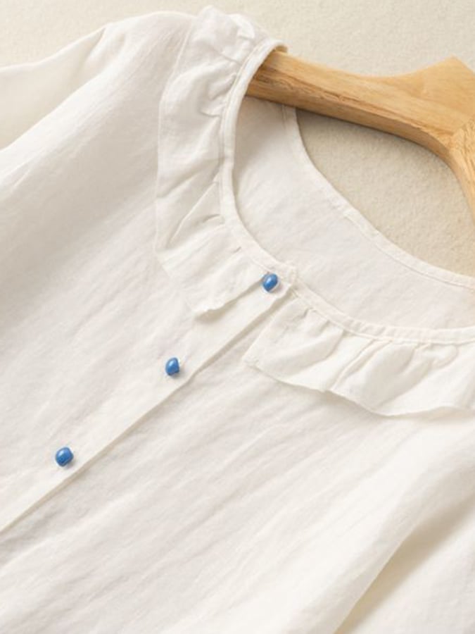 Women's Solid Color V-Neck Button Design Casual Cotton And Linen Shirt