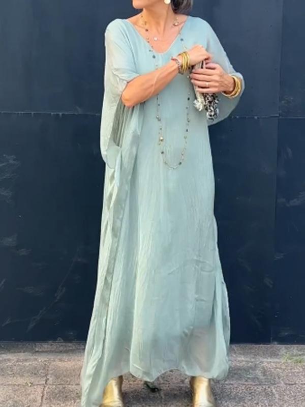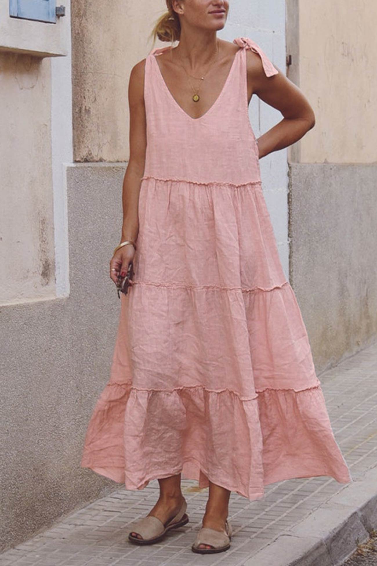 Women's Cotton Linen V-neck Solid Color Pocket Dress