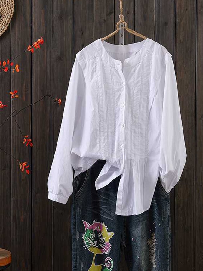 Cotton Round Neck Pleated Long-Sleeved Shirt