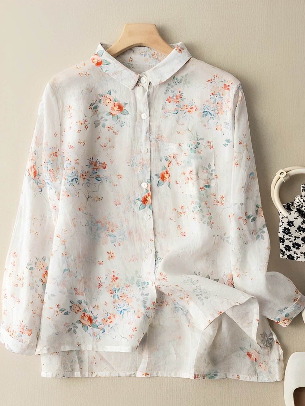 Ramie Floral Print Long Sleeve Button Down Casual Shirt