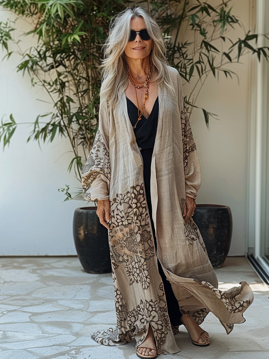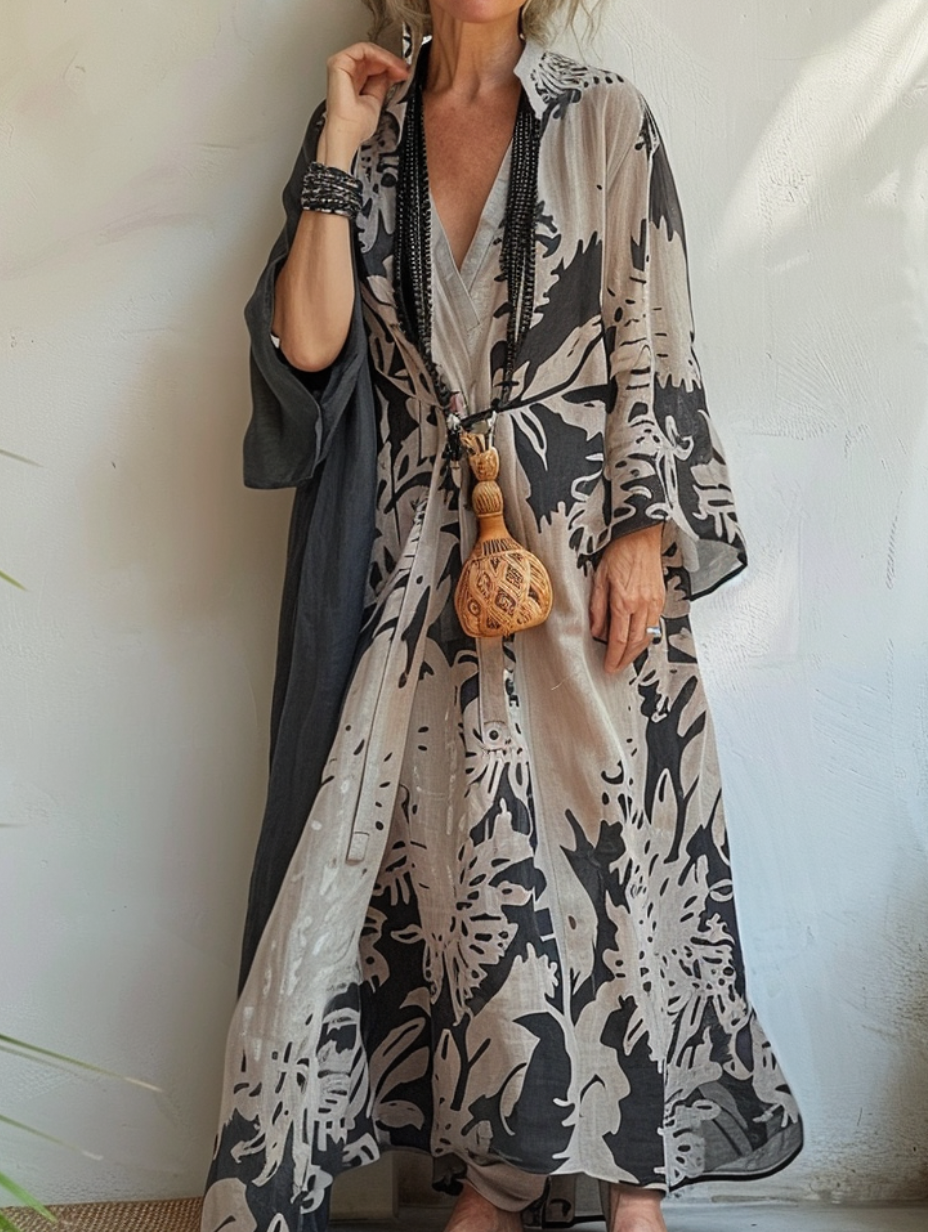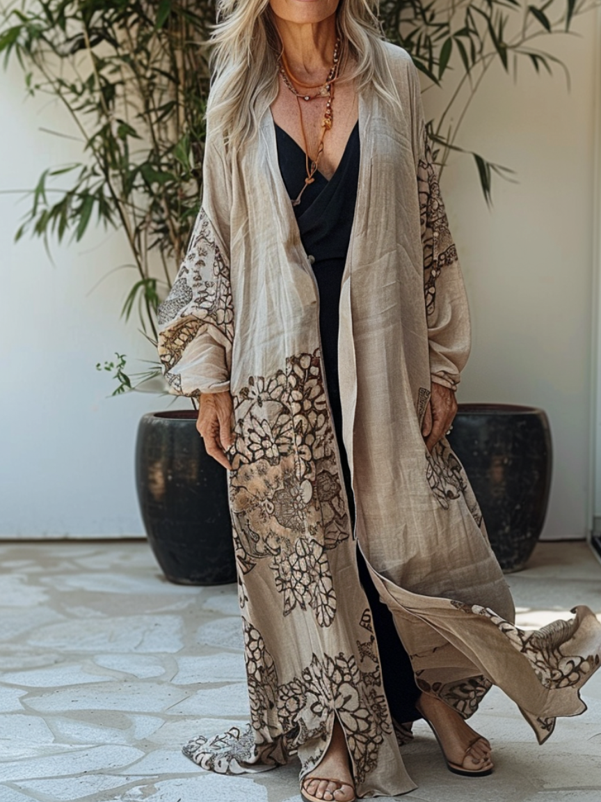Linen Boho Stylish Printed Kaftan Maxi Dress Cardigan