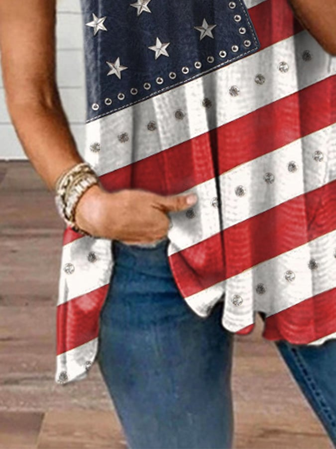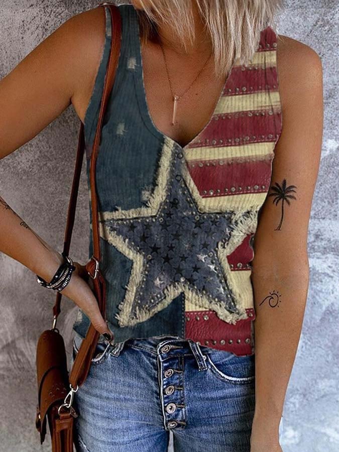 Women's Independence Day Flag Denim Blue Print V-Neck Vest