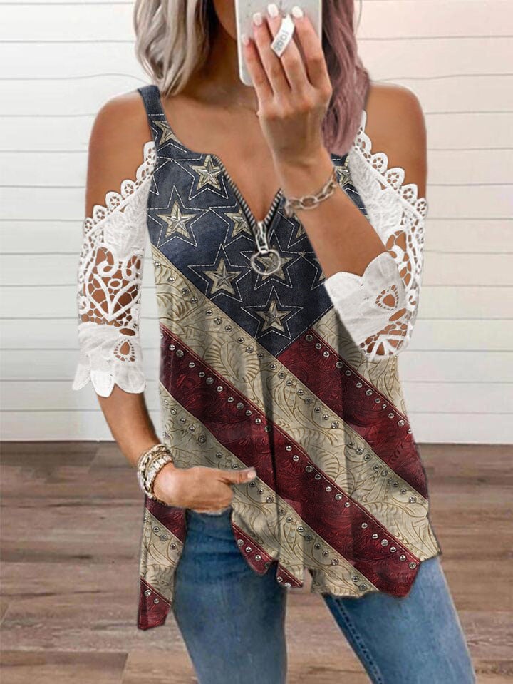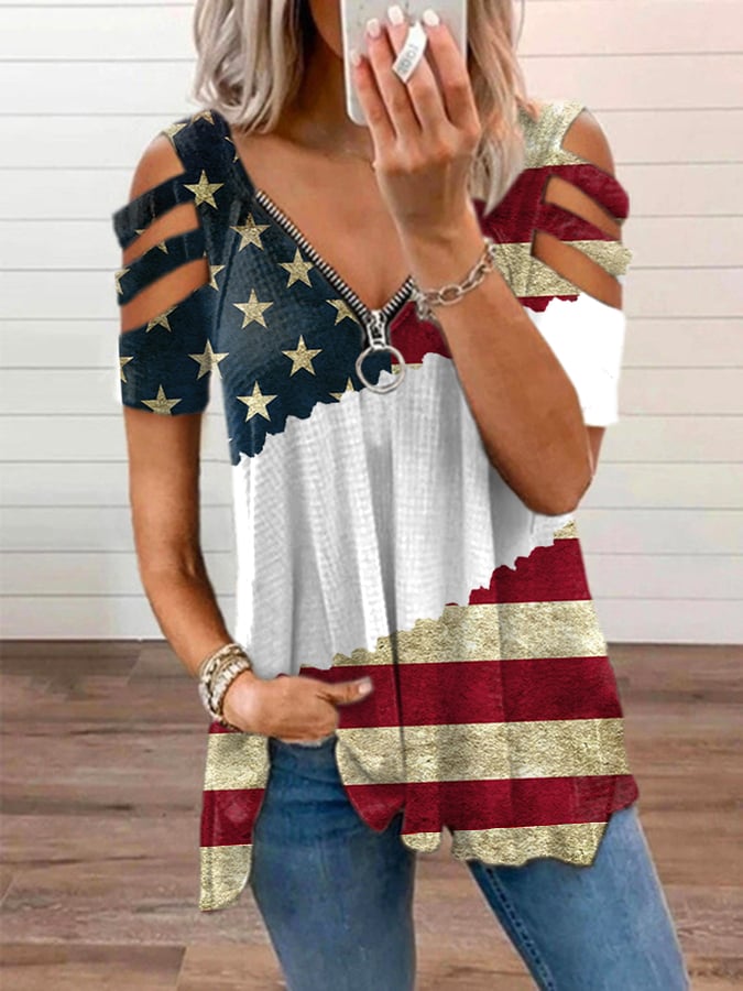 Women's Vintage American Flag Print Zipper Off Shoulder Casual T-Shirt