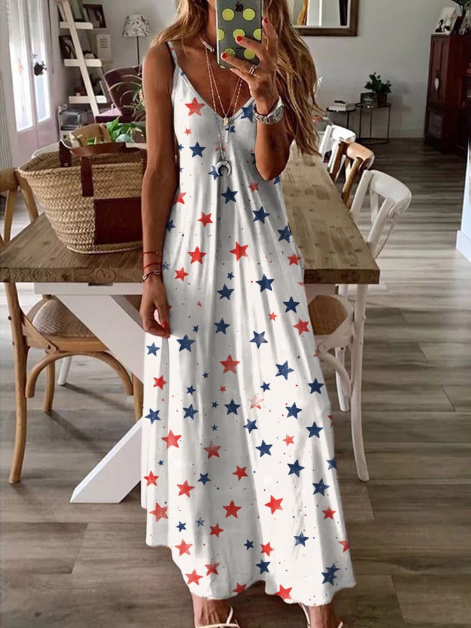 Women's American Flag Pattern Floral Tassel Art Print Sleeveless Maxi Dress