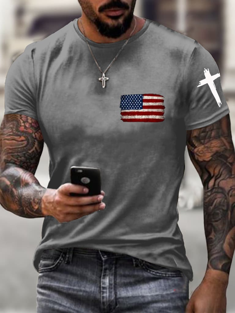 Men's Faith Cross American Flag Sleeve Print T-Shirt