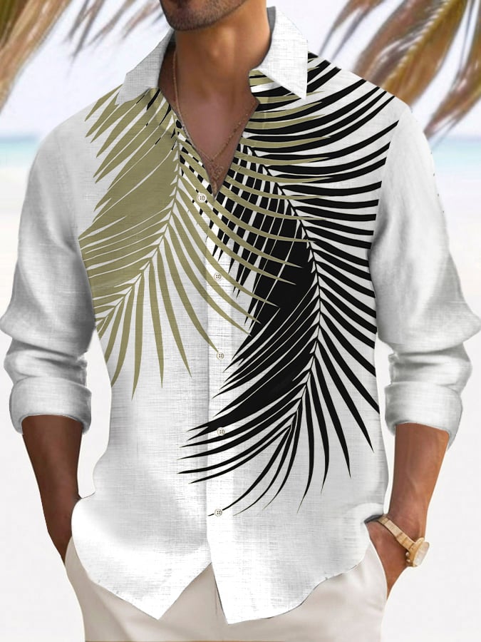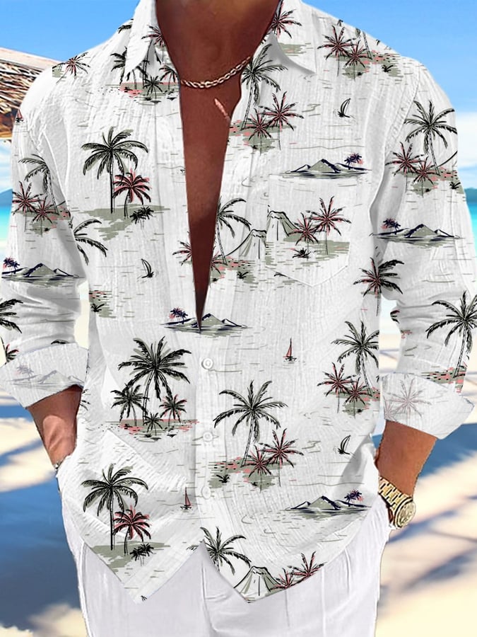 Men's Hawaiian Palm Tree Print Long Sleeve Pocket Shirt