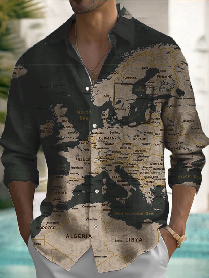 Men's World Map Print Pocket Long Sleeve Shirt