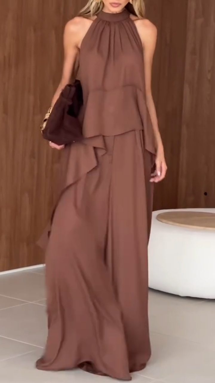 Women's V-neck Hanging Neck Hollow Top+ Pants Solid Color Temperament Casual Suit