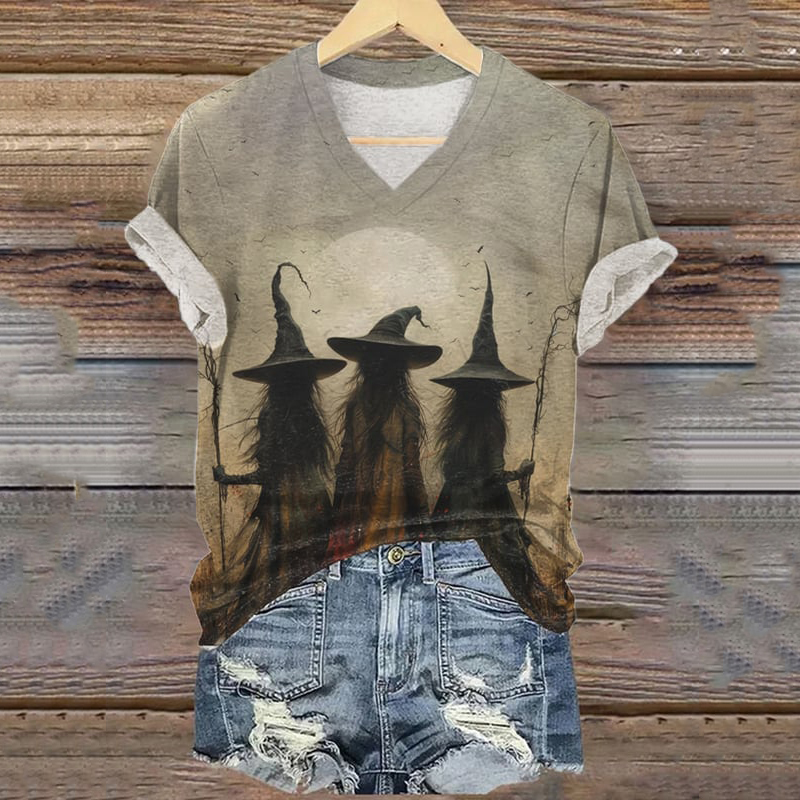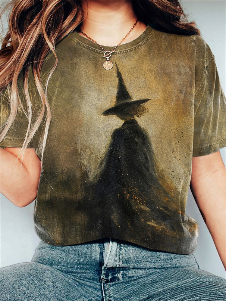 Women's Casual Halloween Watercolor Witch Print T-shirt