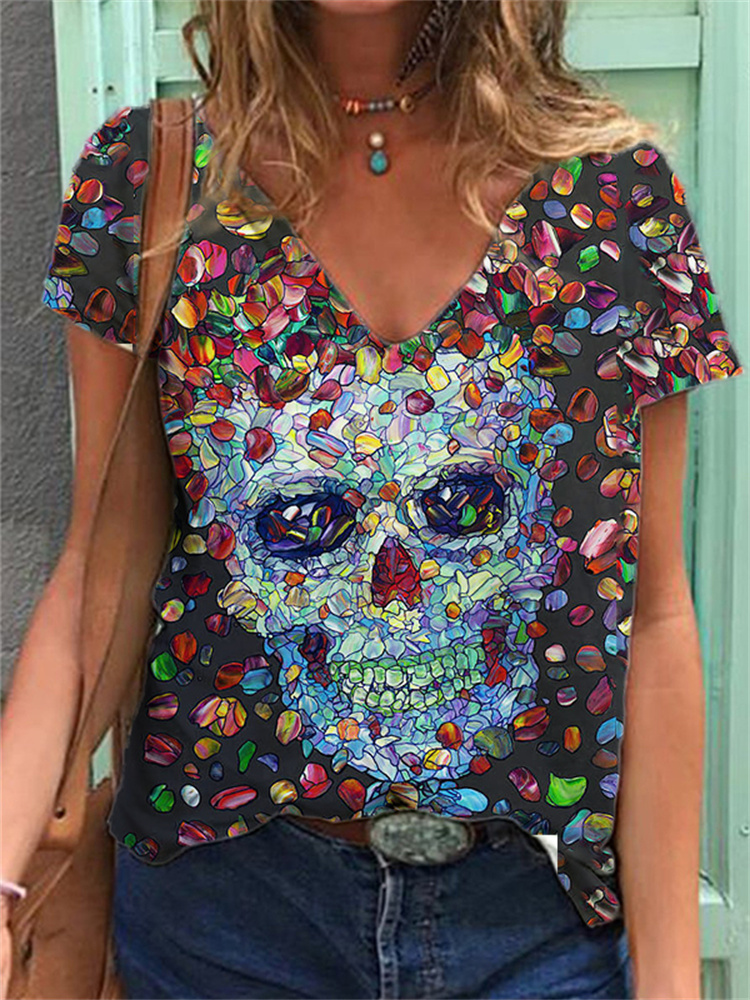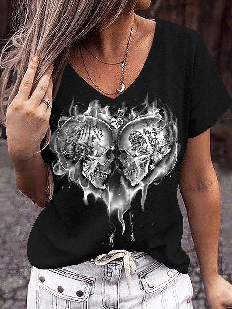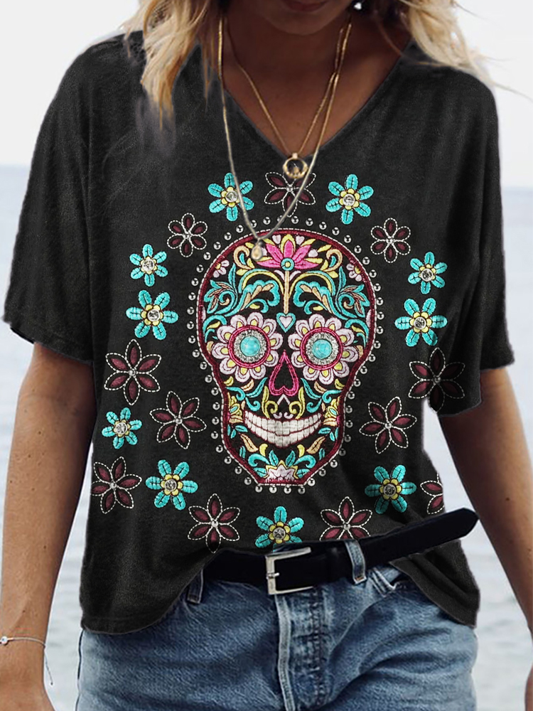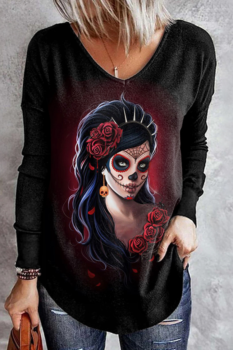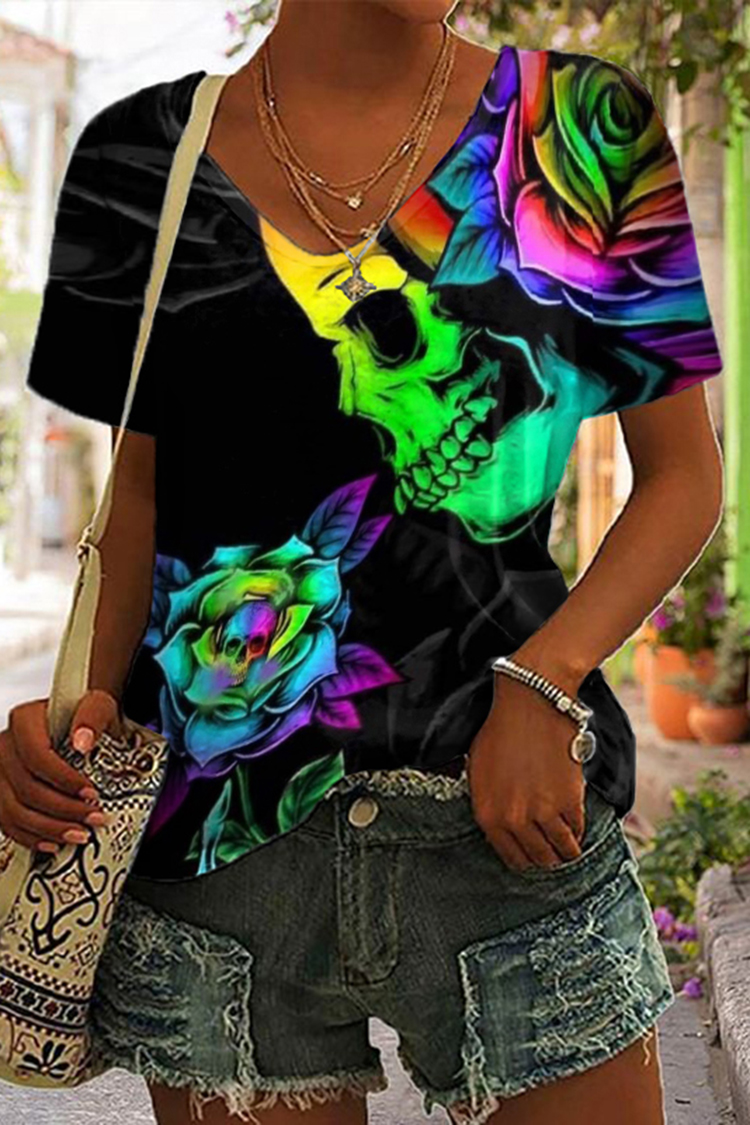 Day Of The Dead Skull And Rose Printed V-Neck T-Shirt