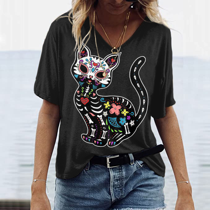 Western Day Of The Dead Cat Skull Printed V Neck T-Shirt