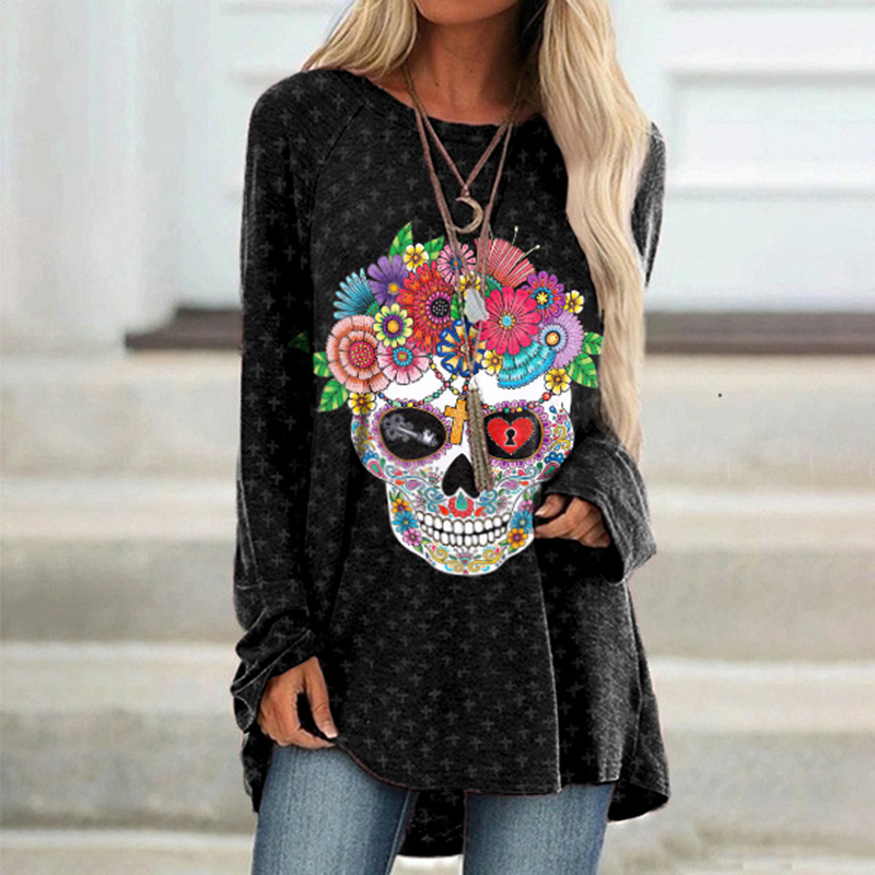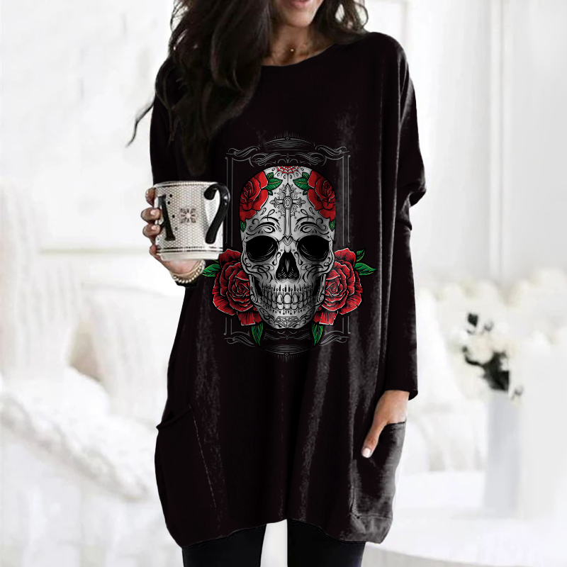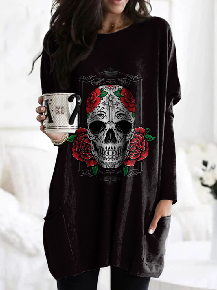 Day Of The Dead Print Crew Neck Pocket Casual Tunic