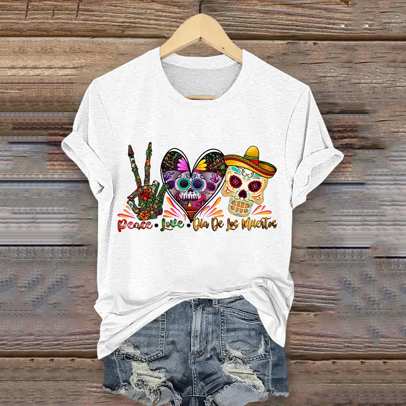 Retro Peace Love Dia De Los Muertos Art Pattern Print Cotton Graphic T-Shirt