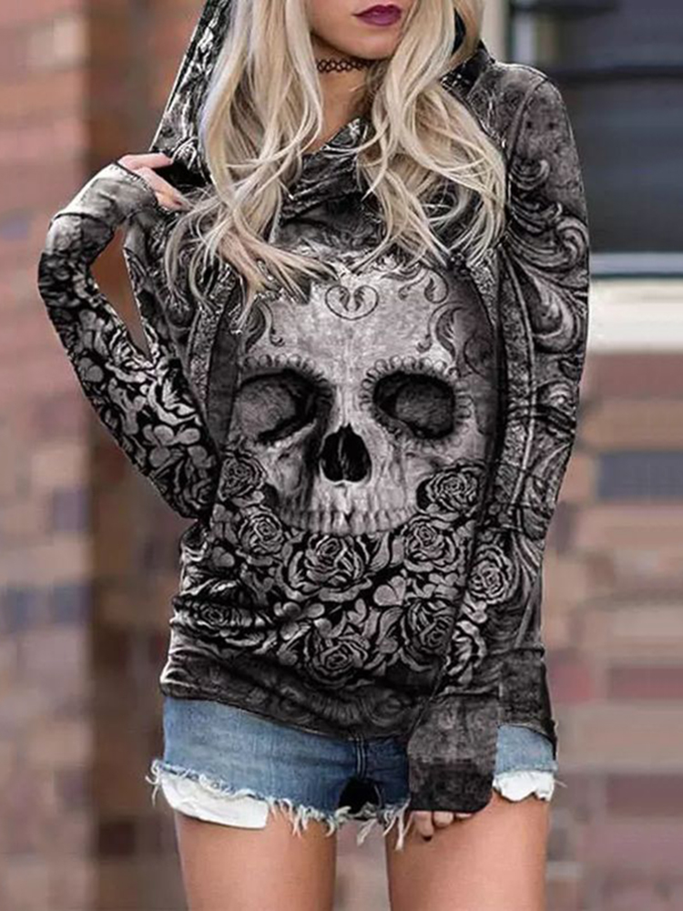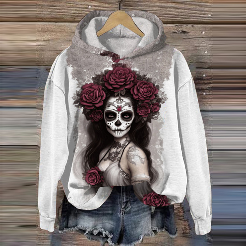 Day Of The Dead Skull Rose Draw Print Casual Hoodie