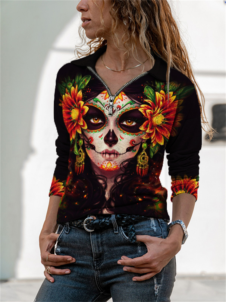 Day Of The Dead Flower Skull Print Lapel T Shirt