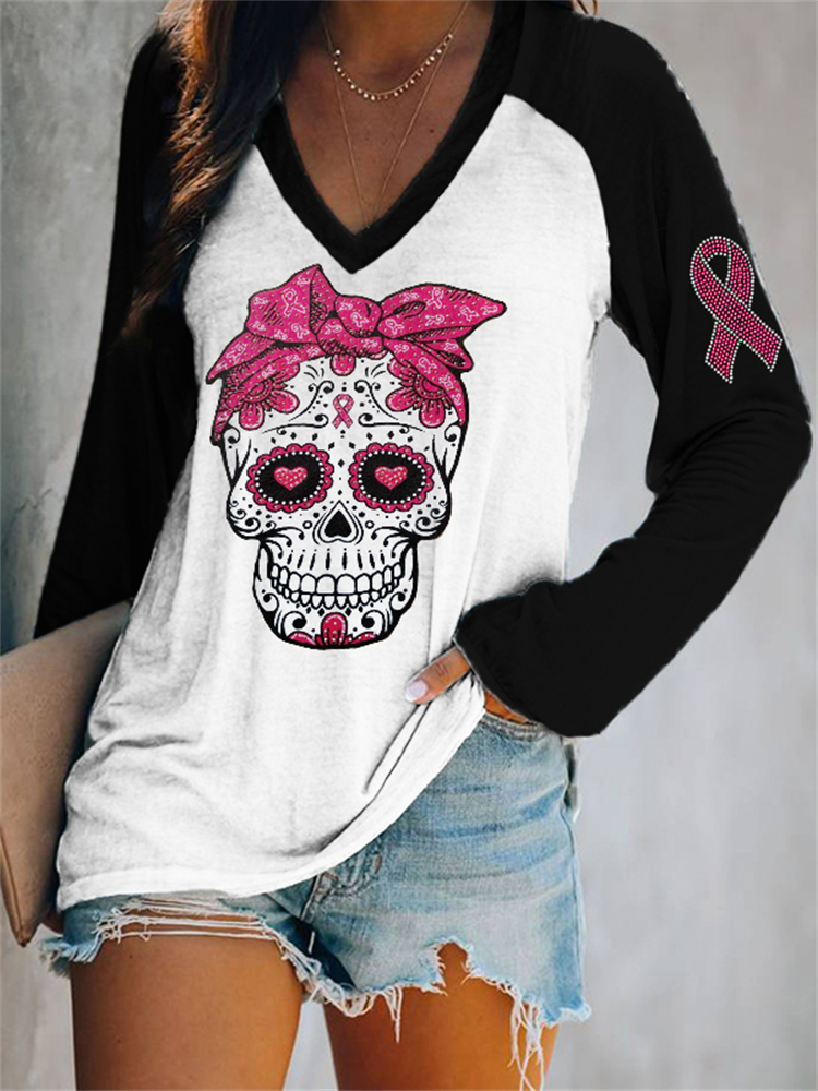 Pink Ribbon Bandana Sugar Skull V Neck T Shirt