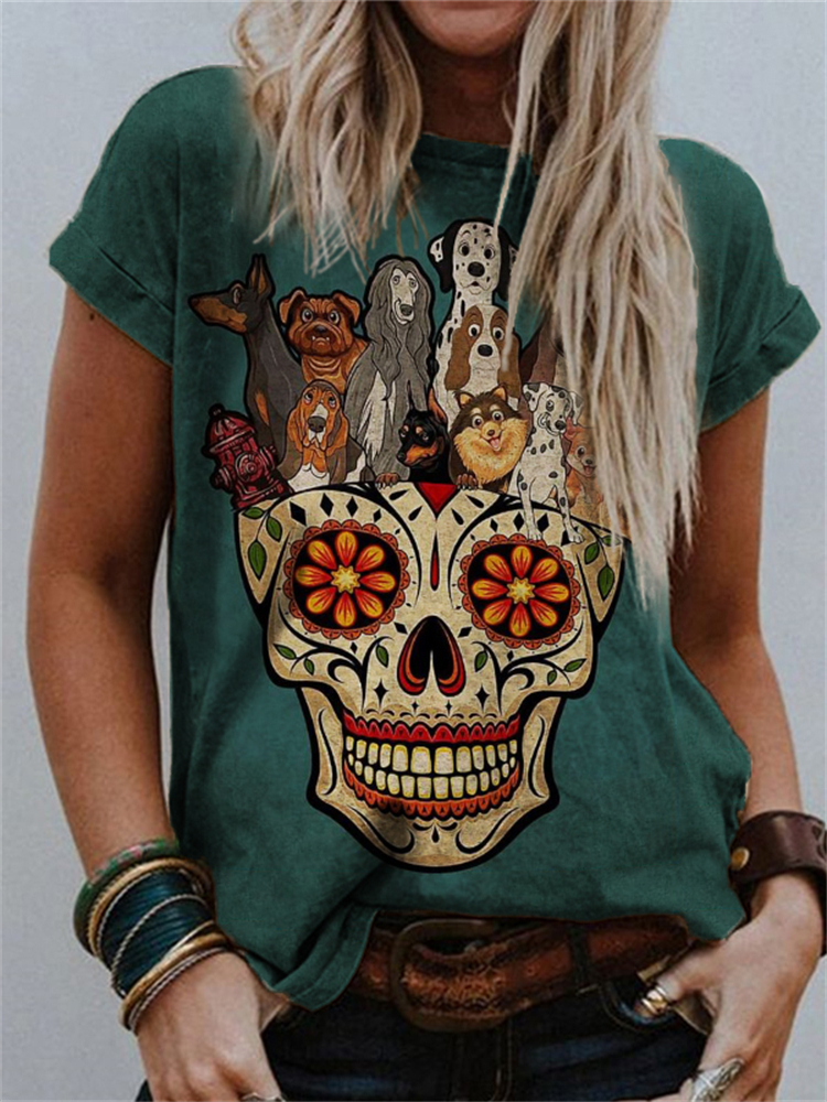 Vintage Lovely Dogs Sugar Skull Crew Neck T Shirt