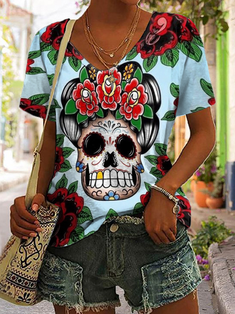 Day Of The Dead Flower Skull Print V Neck T Shirt