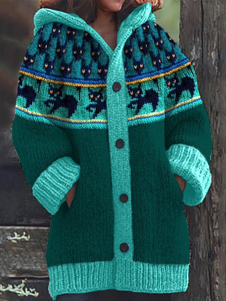 Vintage Black Cats Yoke Contrast Cozy Knit Hooded Cardigan