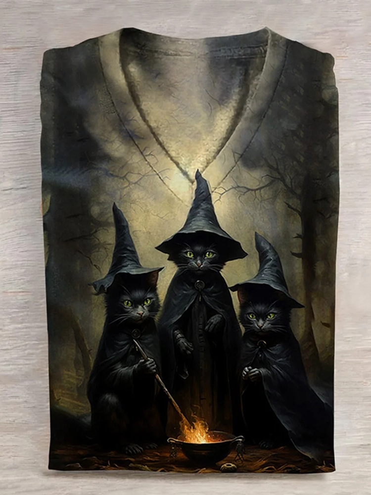 Halloween Cat Art Print Casual V-Neck T-Shirt