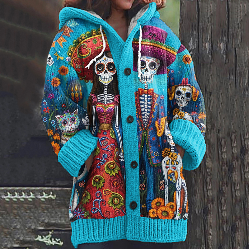 Vintage Mexican Day Of The Dead Skull Art Knitted Cardigan Sweater