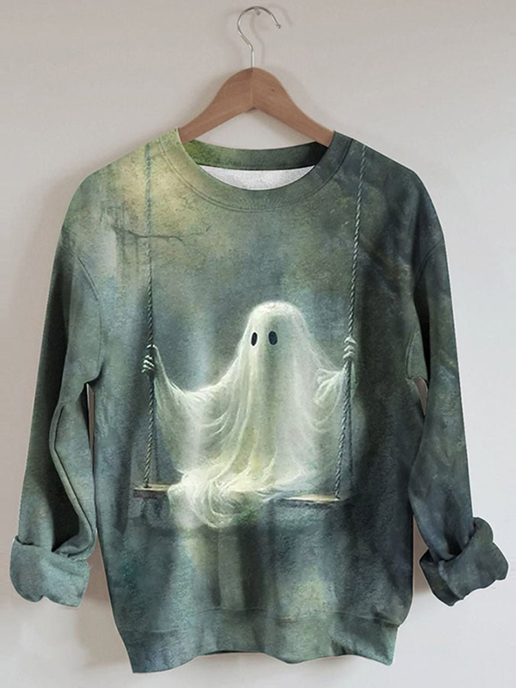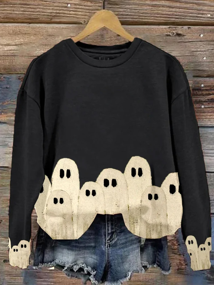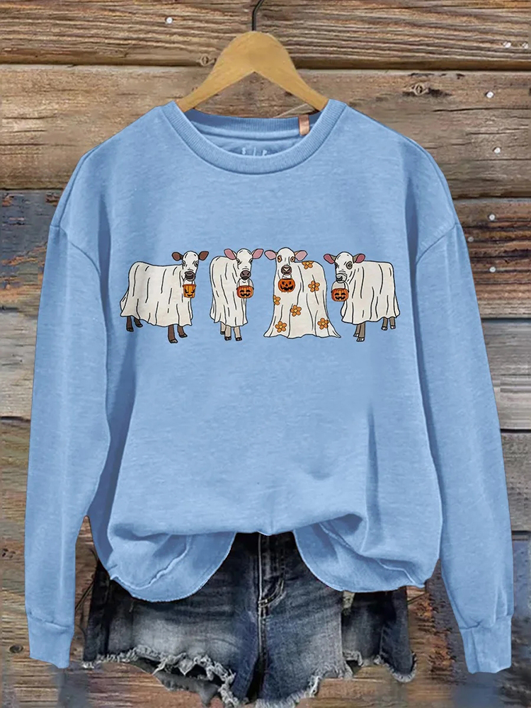Women's Halloween Cow Ghost Print Casual Long Sleeve Sweatshirt