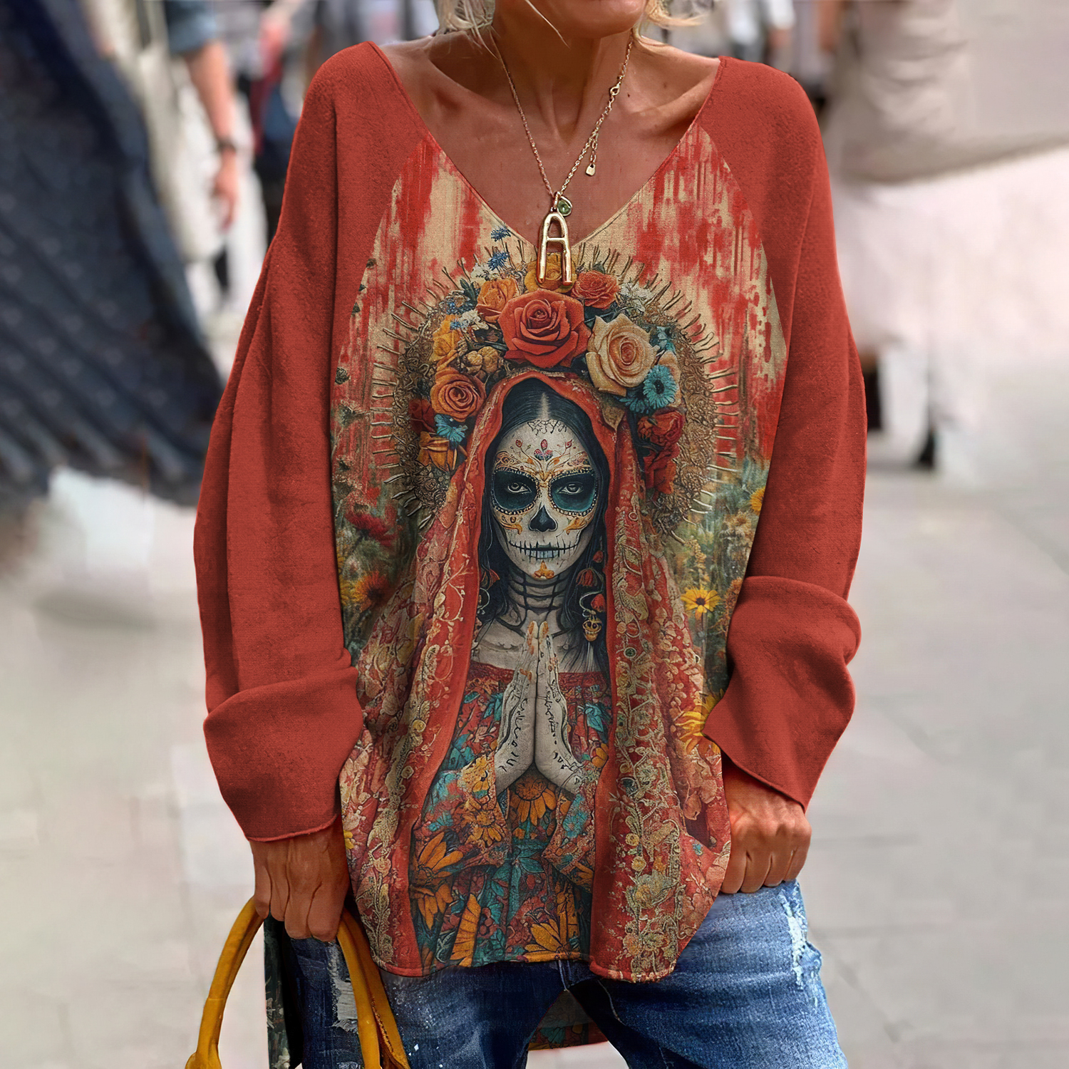 Women's Mexican Sugar Skeleton Couple Catrina Day Of The Dead Inspired Art Print Casual Long Sleeve T-Shirt