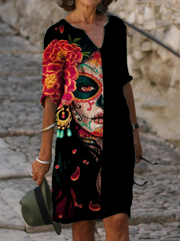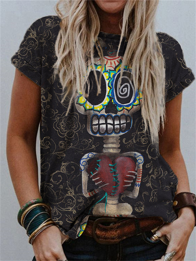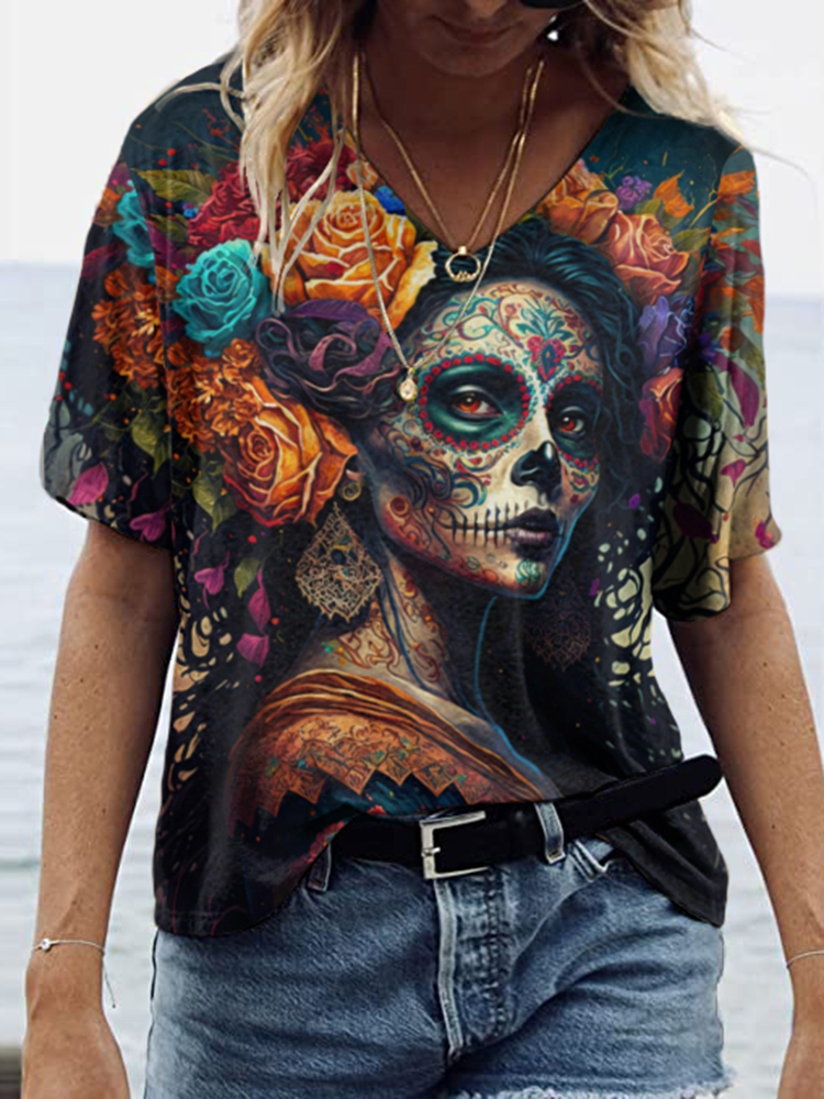 Day Of The Dead Printed V-Neck Short Sleeved T-Shirt