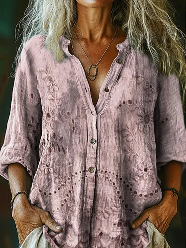 Women's Vintage Floral Textured Art Print Casual Cotton And Linen Shirt